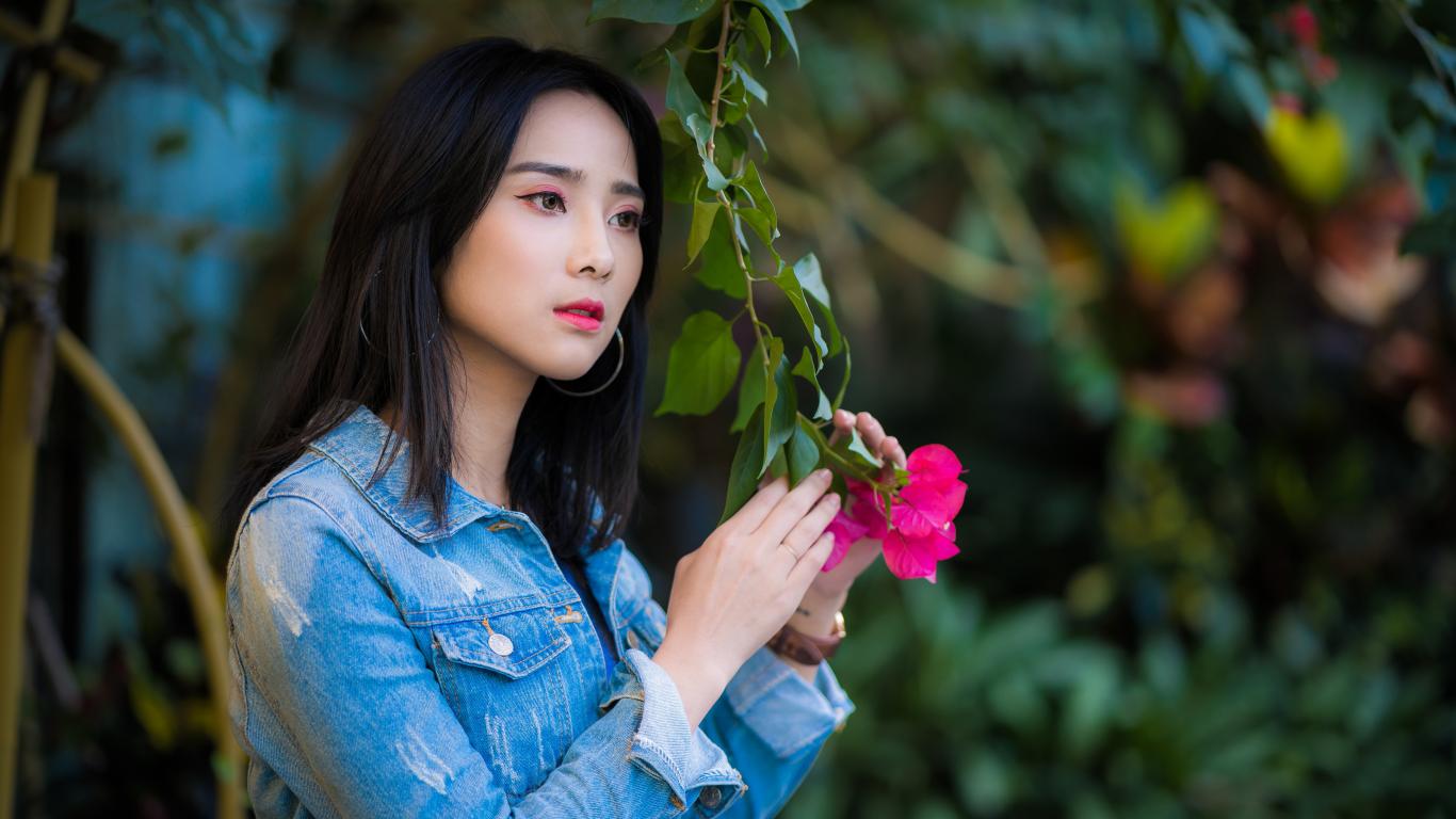 Wallpaper Asian girl in denim jacket in the park
