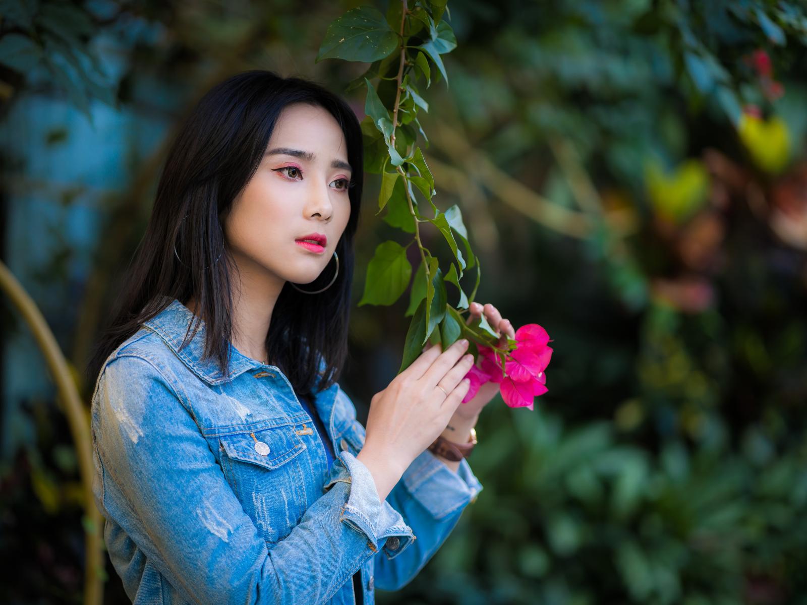 Wallpaper Asian girl in denim jacket in the park
