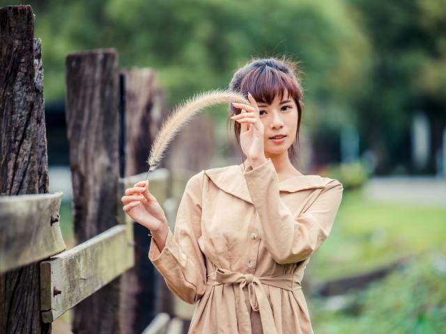 Wallpaper Asian girl in a coat stands at the fence