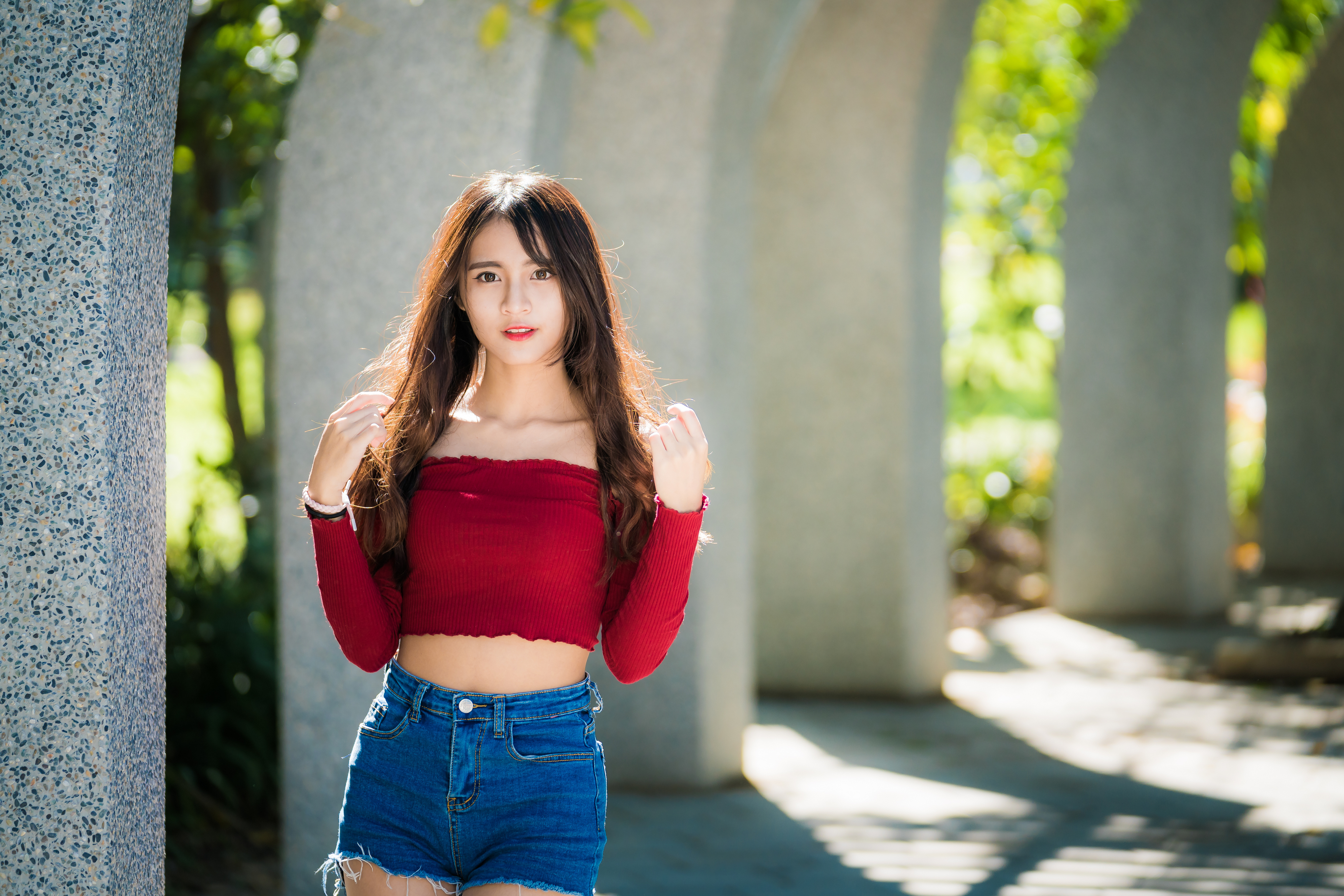 Wallpaper Beautiful Asian girl in shorts and a red hat