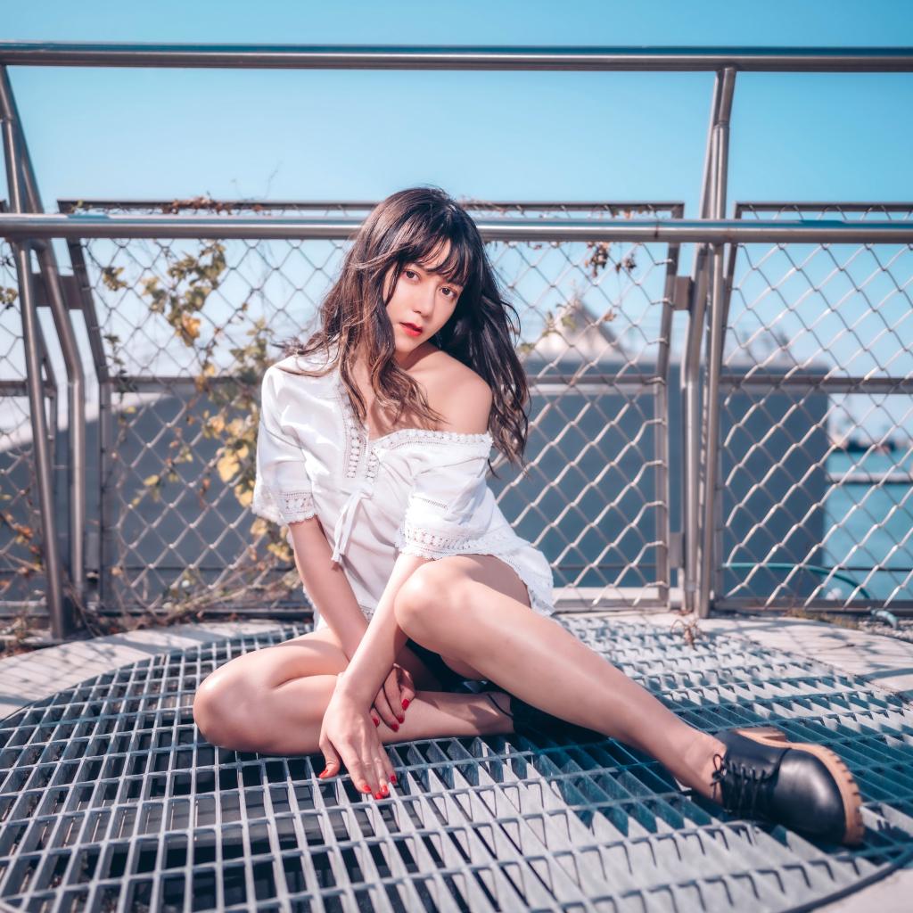 Wallpaper Asian girl in a white dress sits on a grid