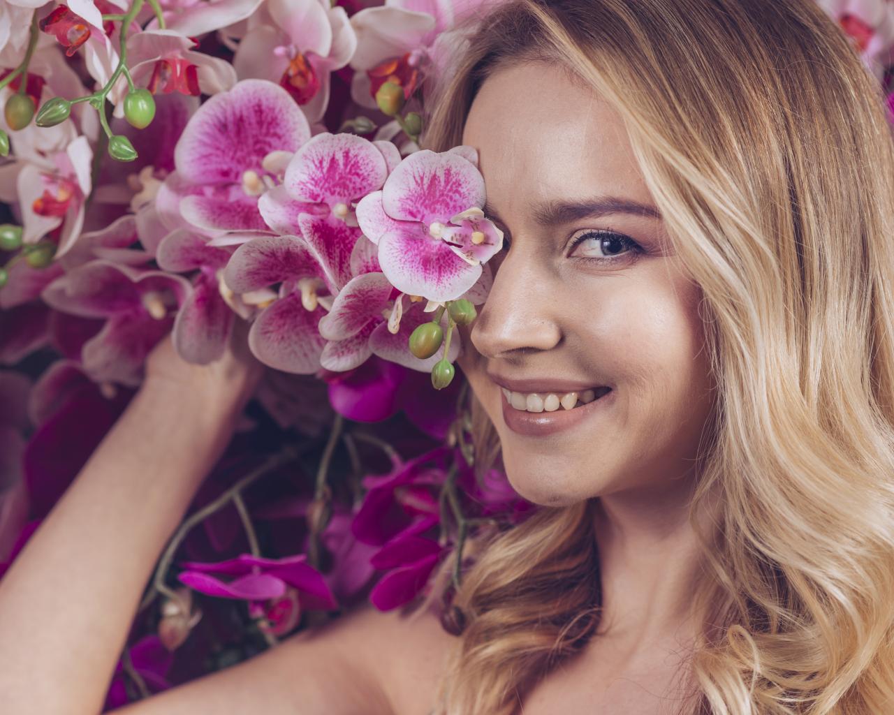 Wallpaper Beautiful blonde girl with orchid flowers