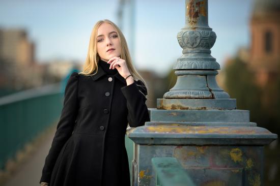 Wallpaper Beautiful blonde in a black coat stands at the lantern