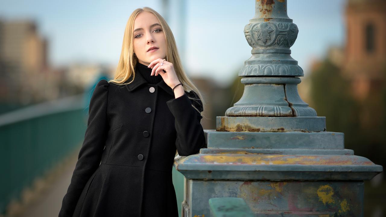Wallpaper Beautiful blonde in a black coat stands at the lantern