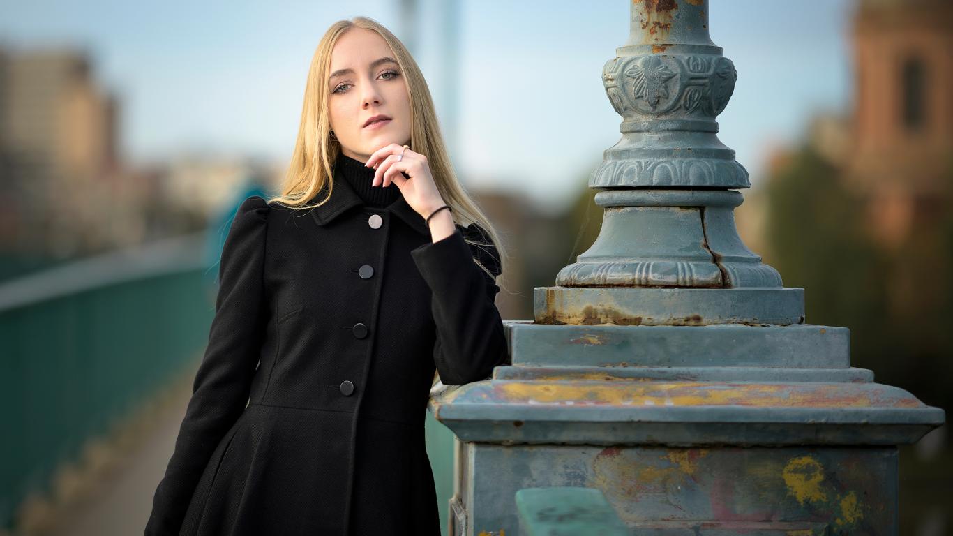 Wallpaper Beautiful blonde in a black coat stands at the lantern