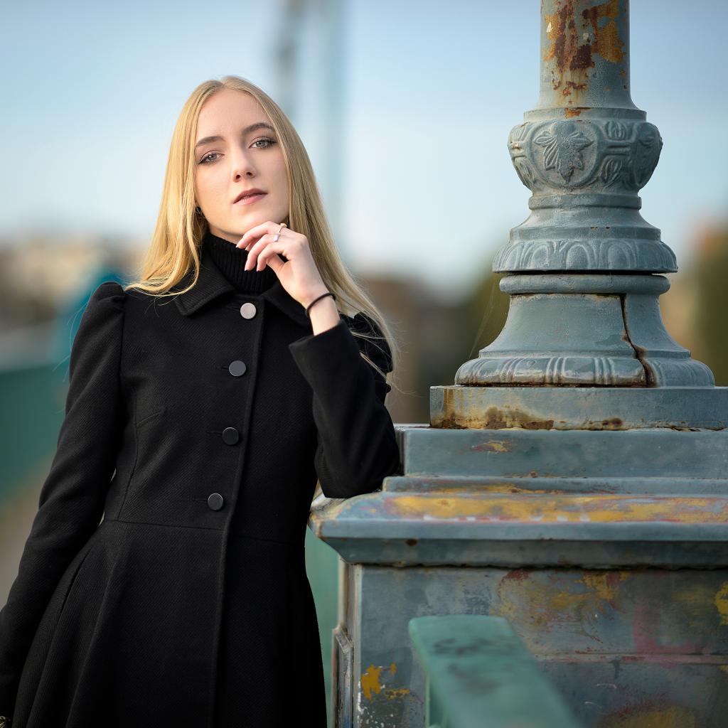 Wallpaper Beautiful blonde in a black coat stands at the lantern