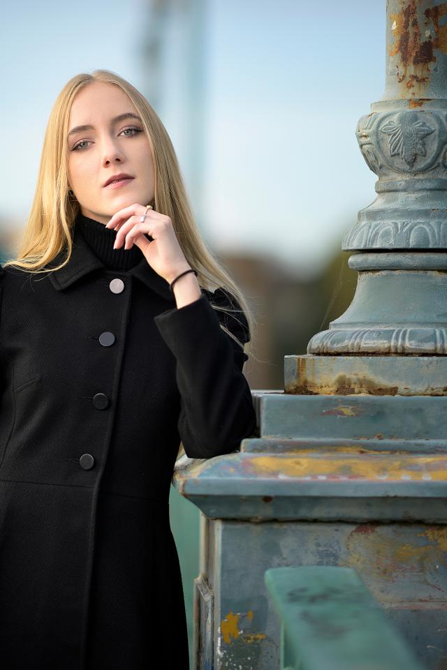 Wallpaper Beautiful blonde in a black coat stands at the lantern