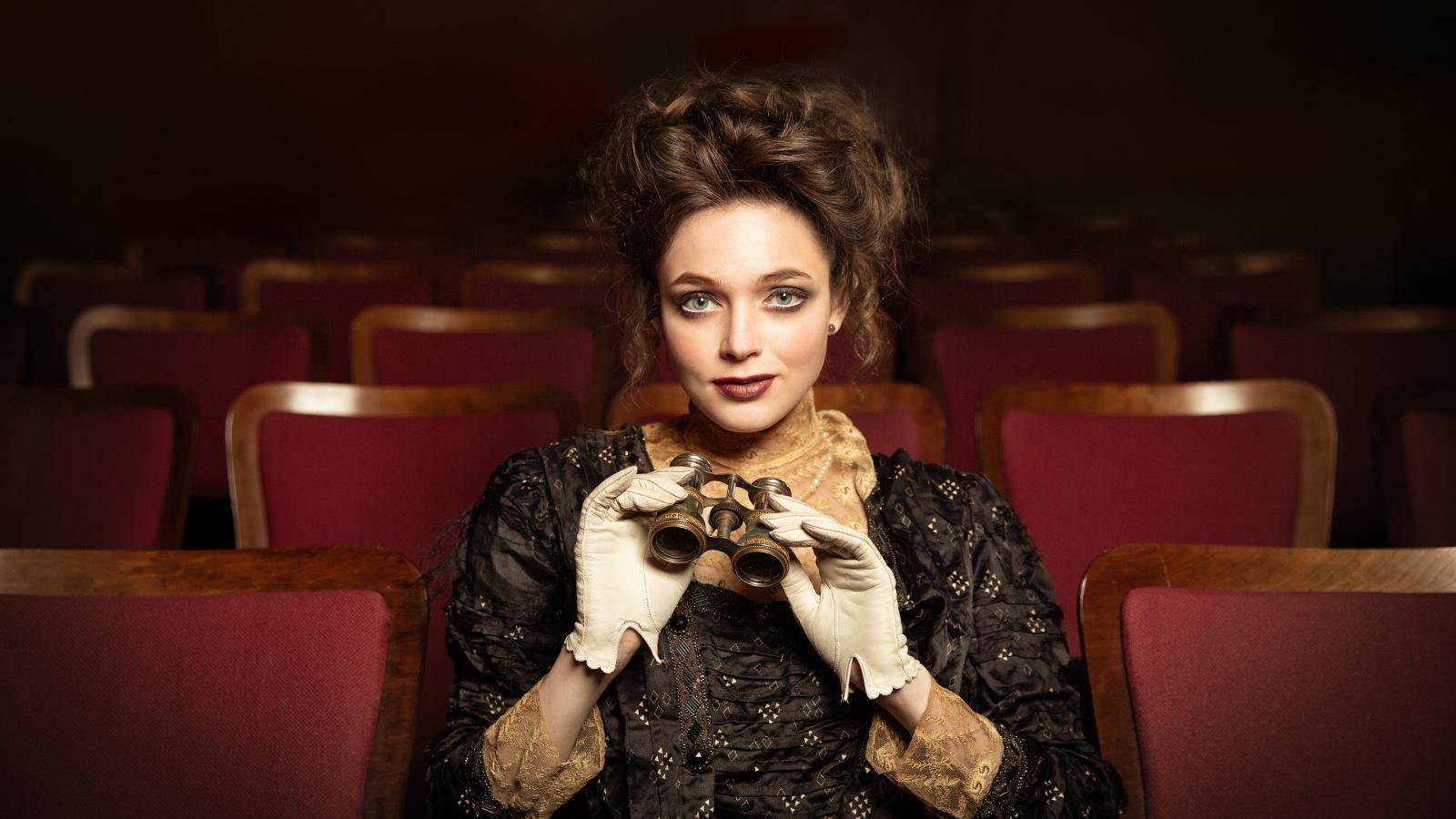Wallpaper Beautiful girl with binoculars sits in a theater