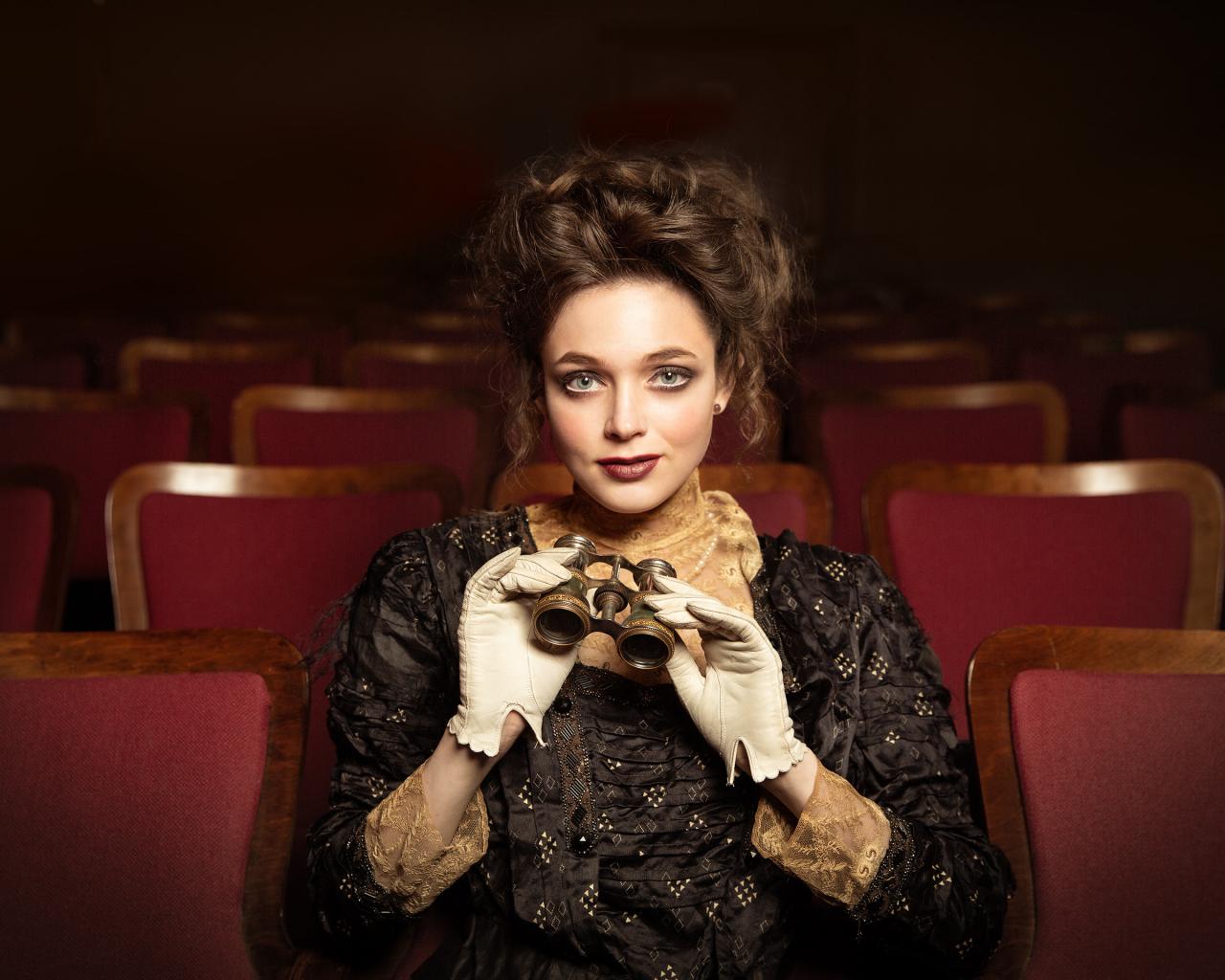 Wallpaper Beautiful girl with binoculars sits in a theater