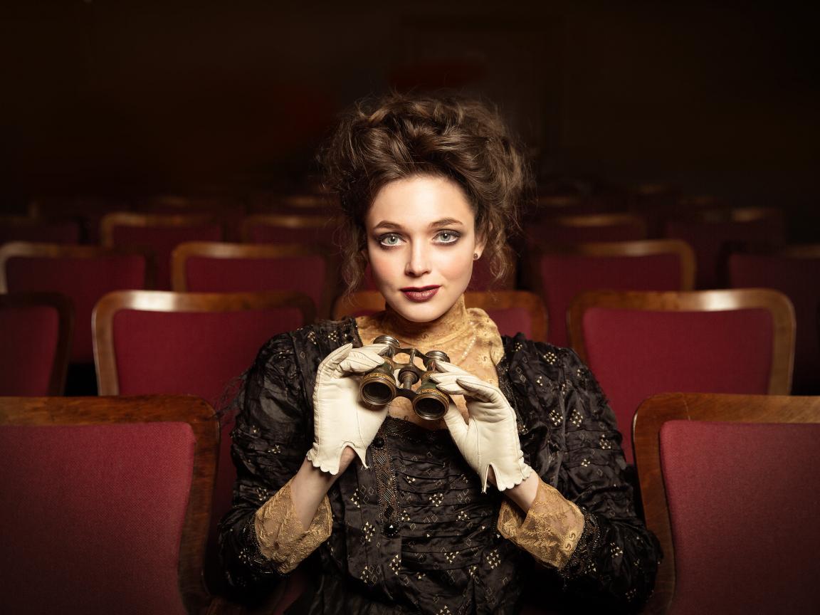 Wallpaper Beautiful girl with binoculars sits in a theater