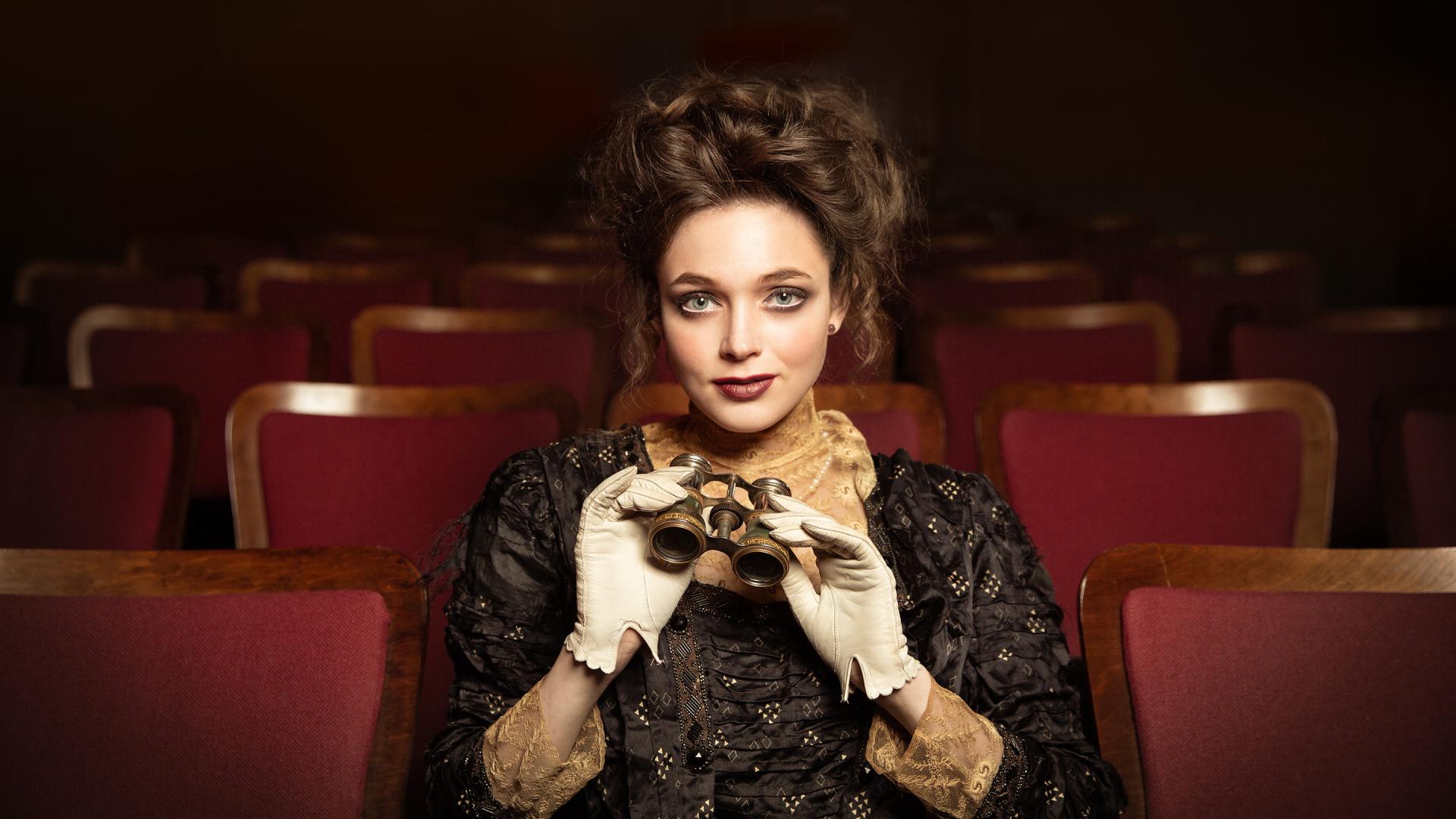 Wallpaper Beautiful girl with binoculars sits in a theater