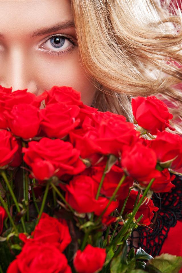 Wallpaper Beautiful blue-eyed blonde with a bouquet of red roses