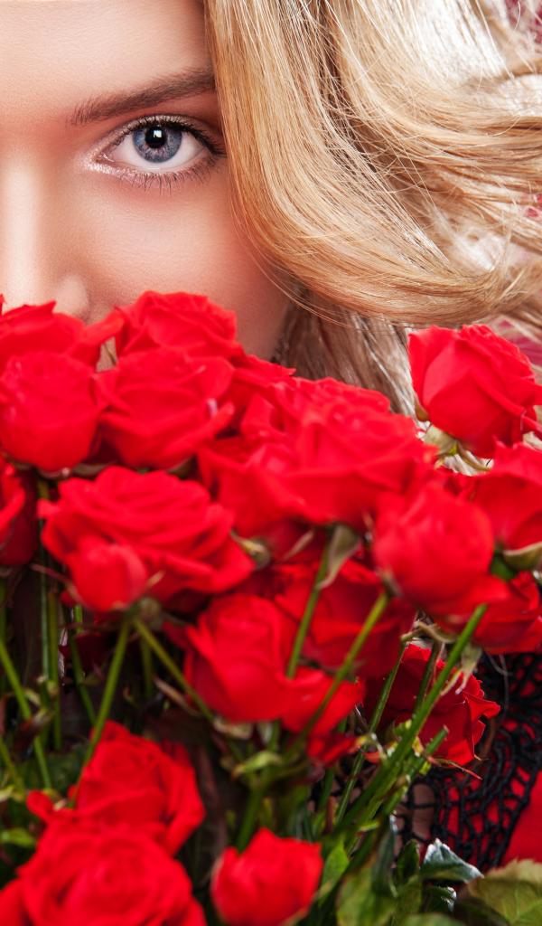 Wallpaper Beautiful blue-eyed blonde with a bouquet of red roses