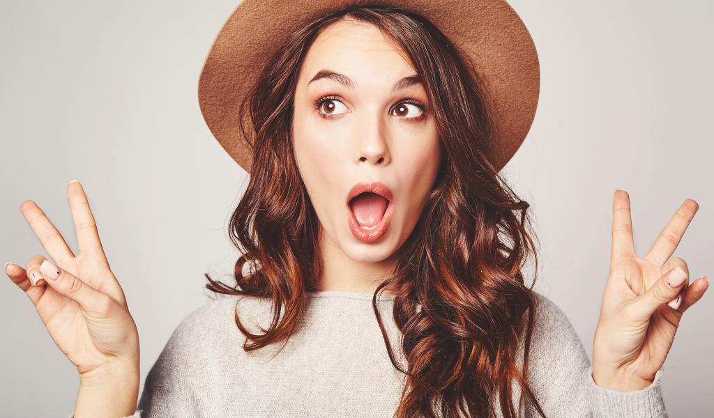 Wallpaper Surprised girl with long hair in a brown hat.