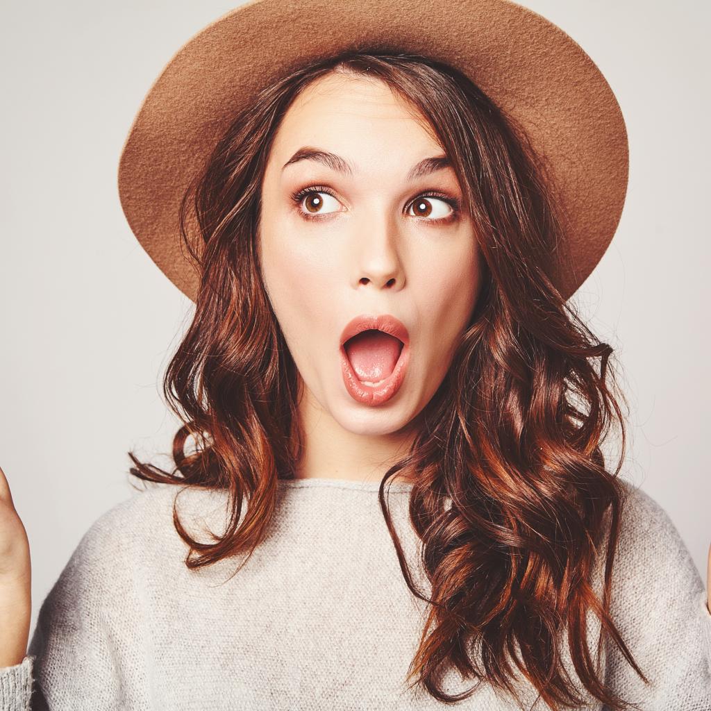 Wallpaper Surprised girl with long hair in a brown hat.