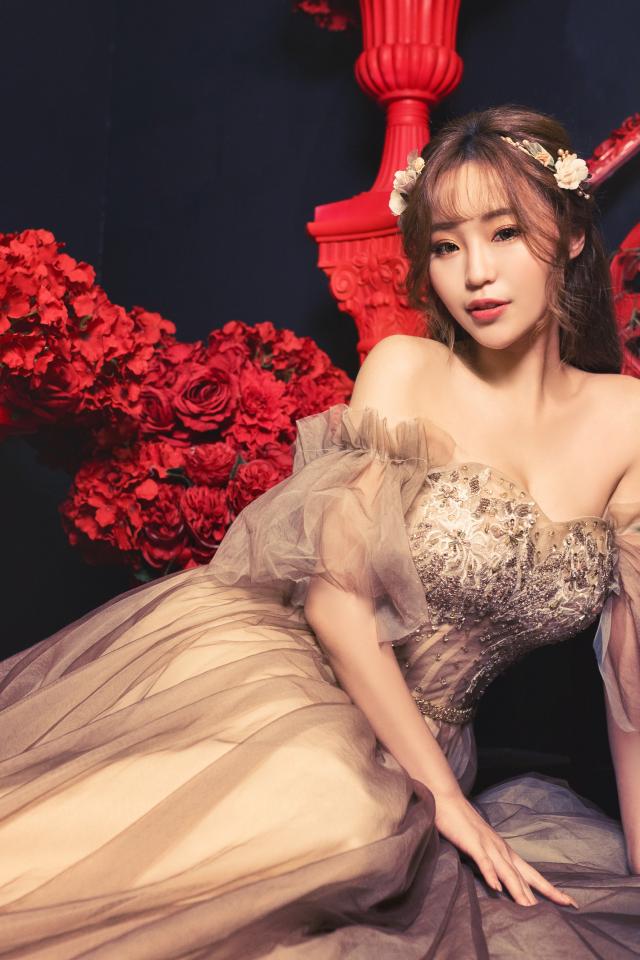 Wallpaper Asian in a beautiful dress in a room with red flowers