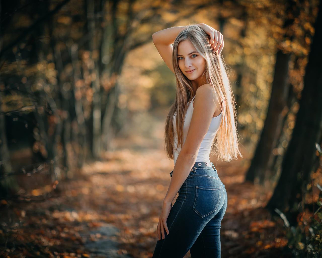 Wallpaper Long-haired blonde in jeans in the forest