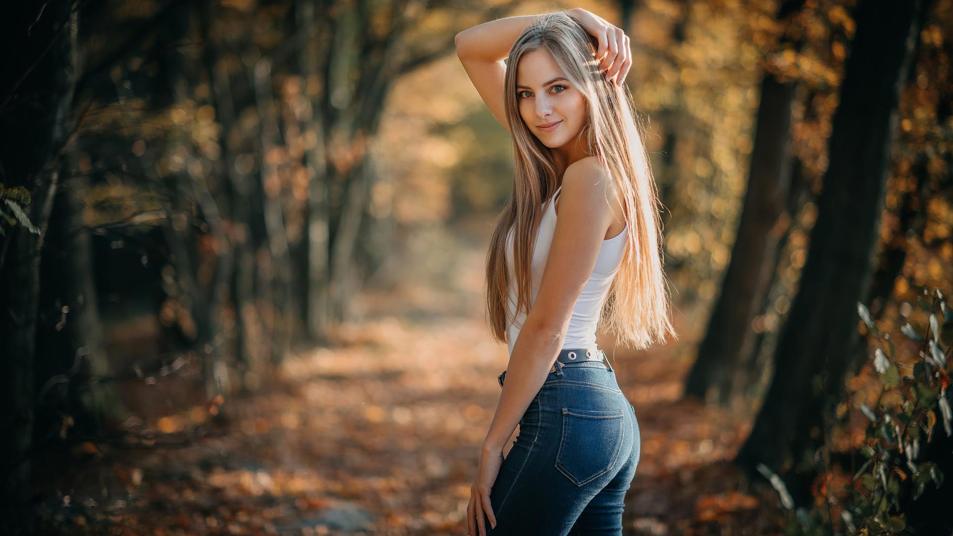 Wallpaper Long-haired blonde in jeans in the forest