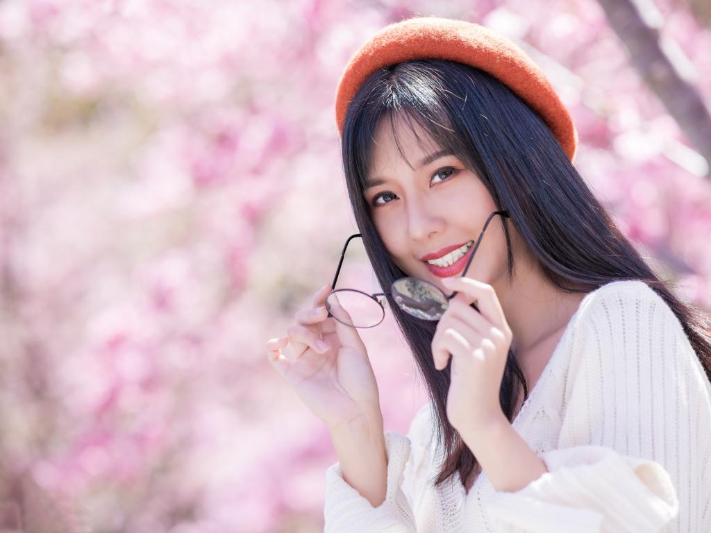 Wallpaper Asian girl in a red beret with glasses in hands
