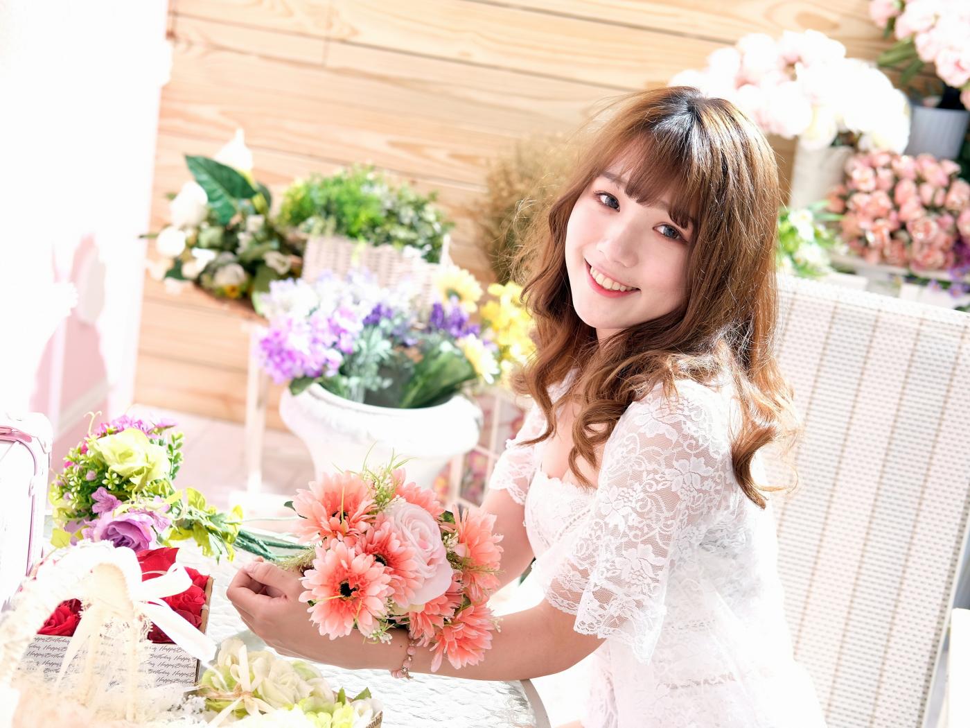 Wallpaper Smiling asian girl in white lace dress