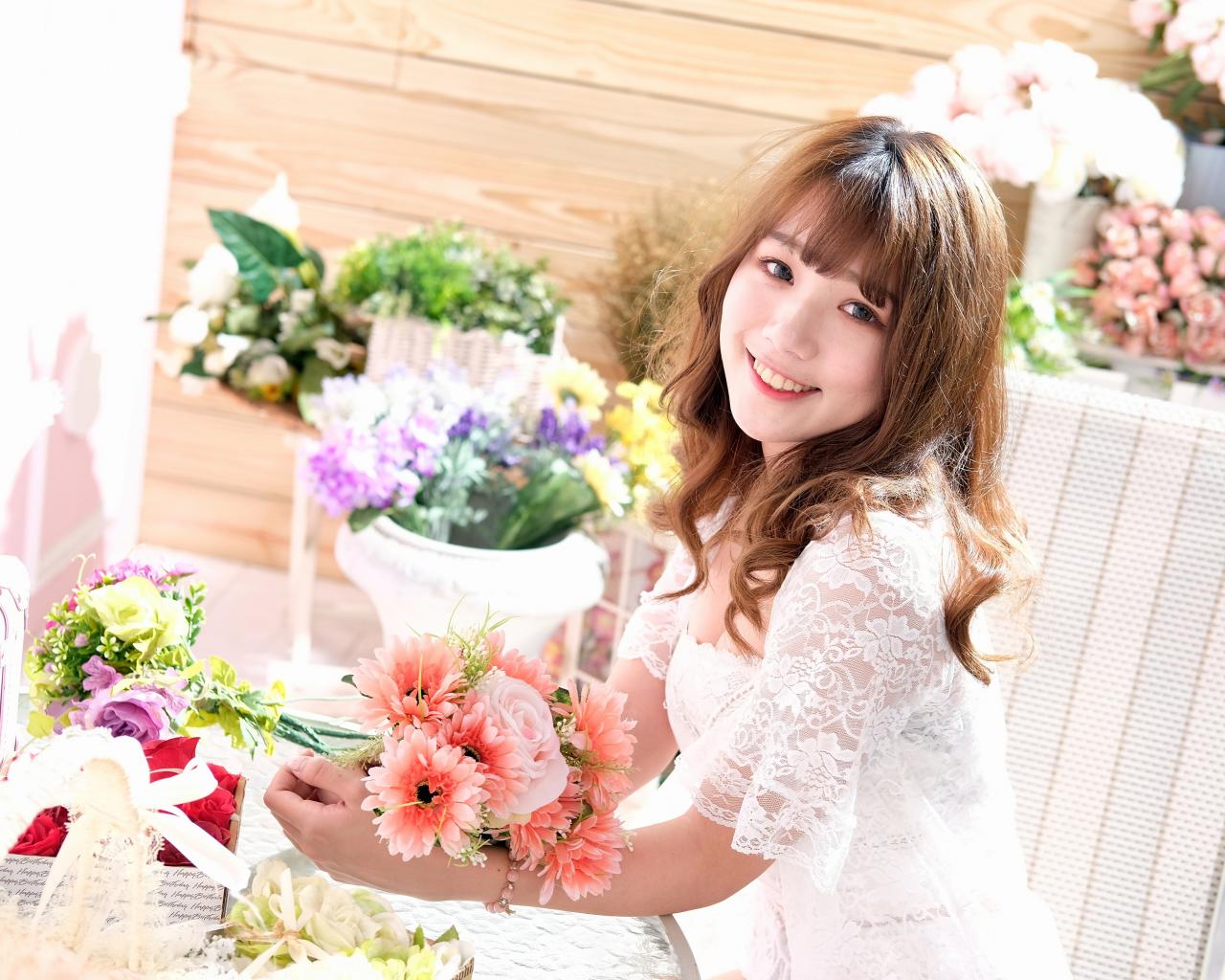 Wallpaper Smiling asian girl in white lace dress