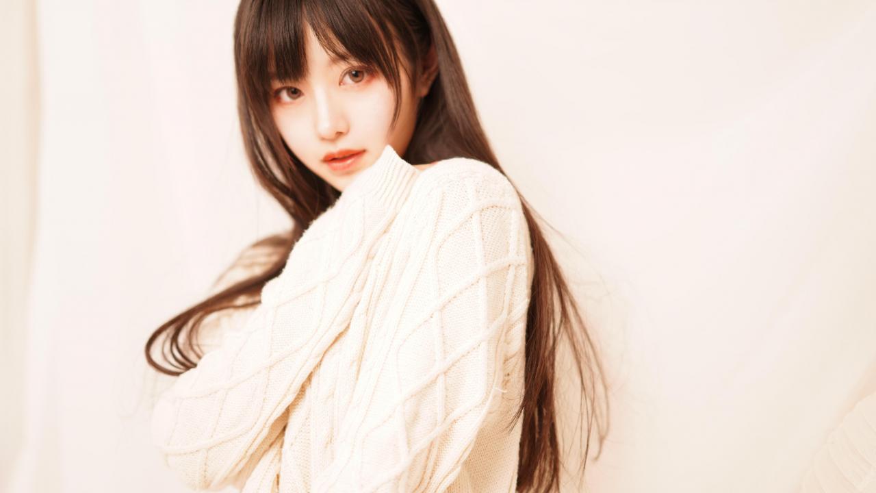 Wallpaper Cute Asian in a white sweater on a pink background
