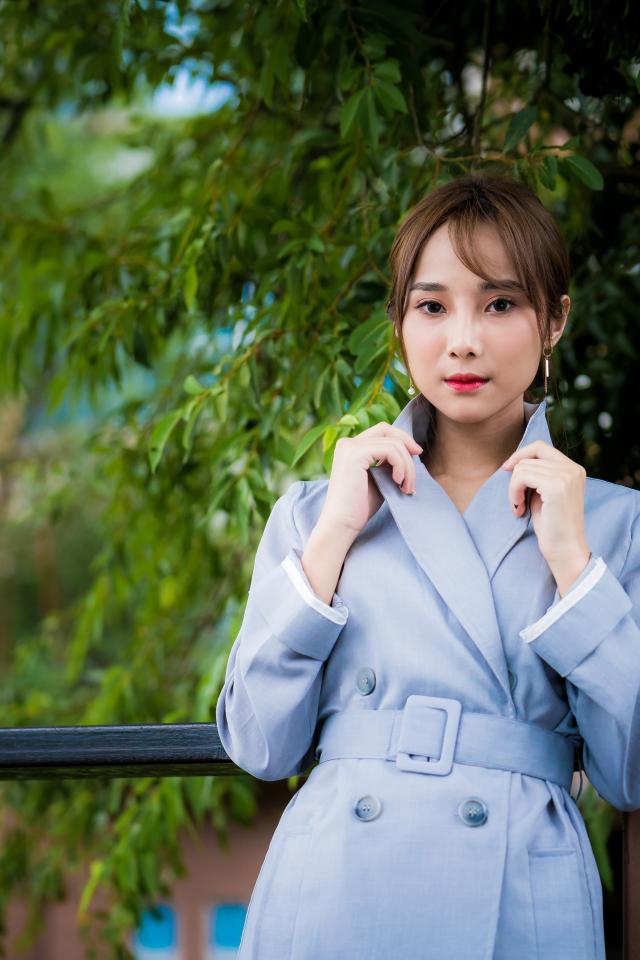 Wallpaper Asian girl in a blue coat in the park