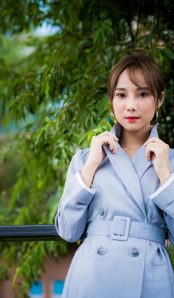 Wallpaper Asian girl in a blue coat in the park