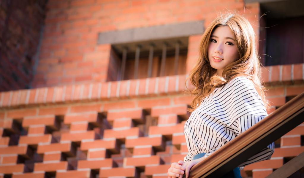 Wallpaper Cute girl in a striped shirt stands on the steps.