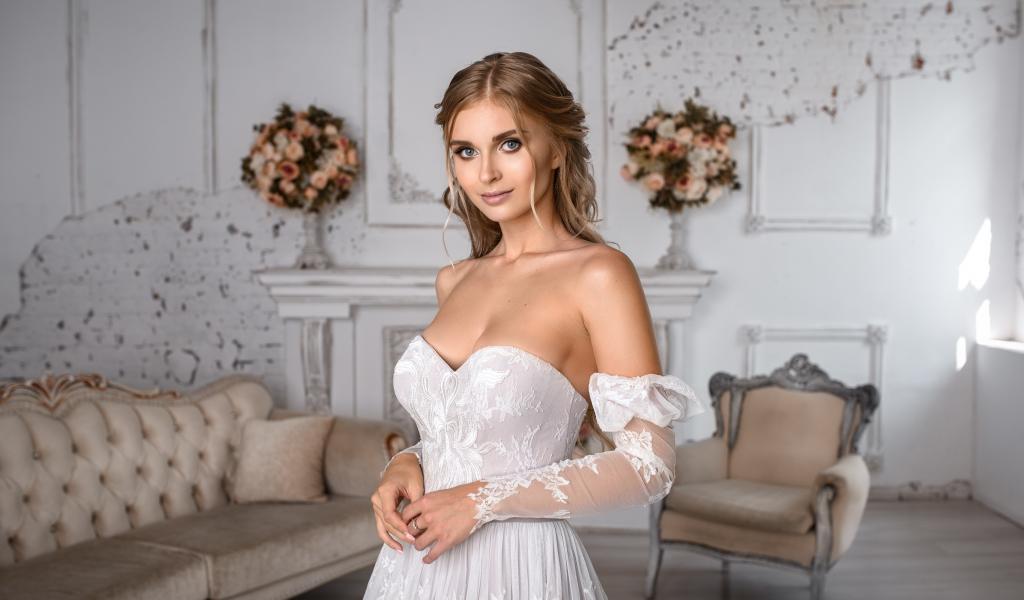 Wallpaper Lovely girl in a wedding dress in a room with a sofa