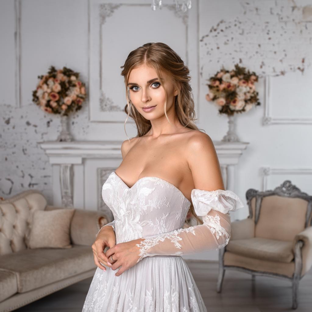 Wallpaper Lovely girl in a wedding dress in a room with a sofa