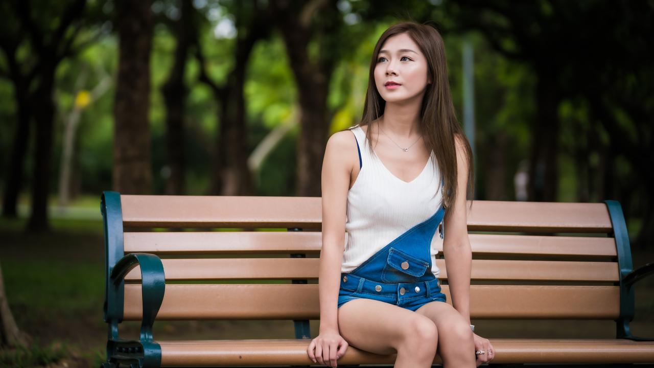 Wallpaper Young Asian girl sitting in a park on a bench