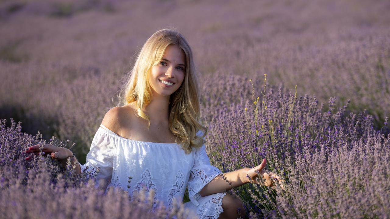 Wallpaper Smiling girl in a white dress on a lavender field