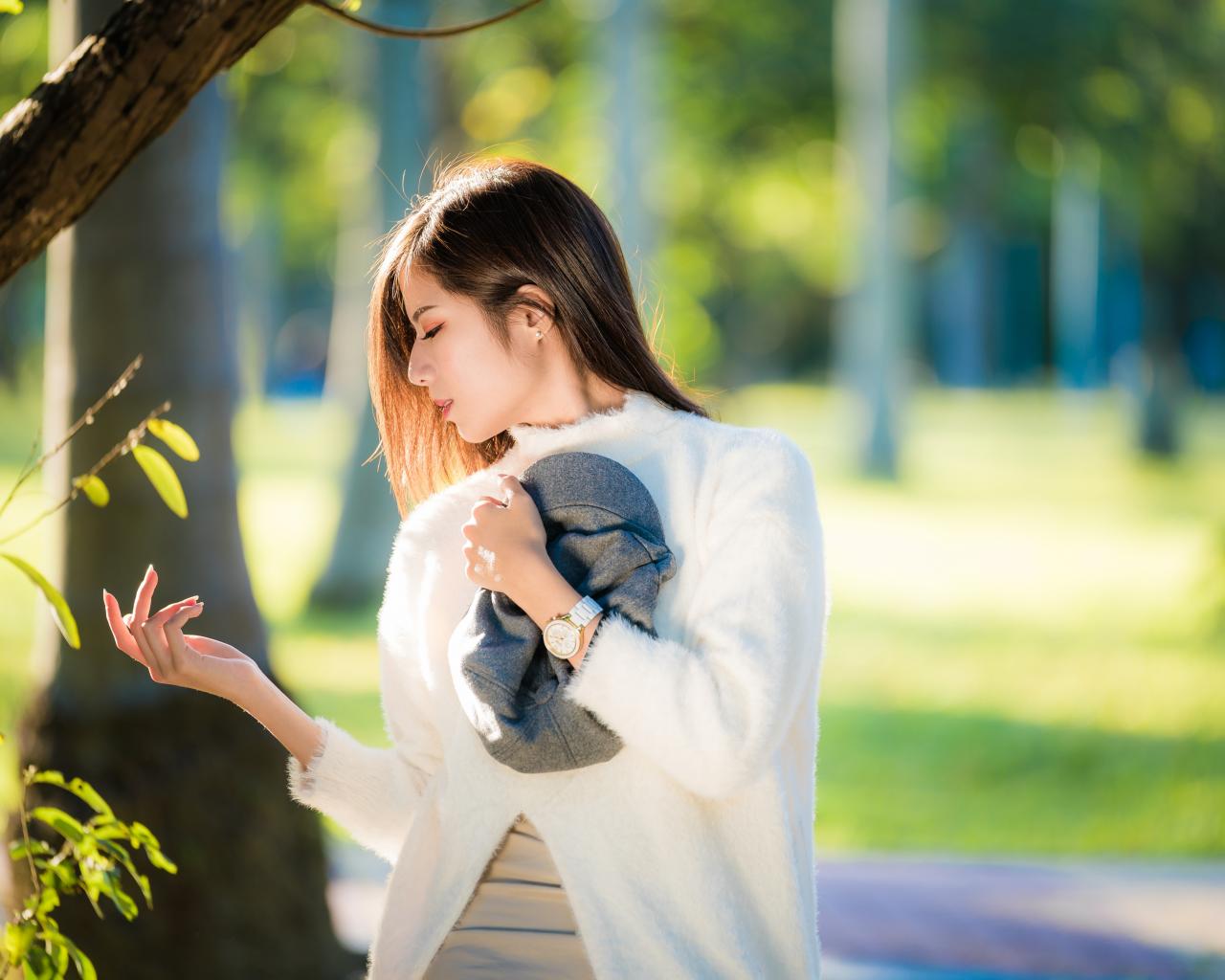 Wallpaper Beautiful Asian in a white sweater in a sunny park