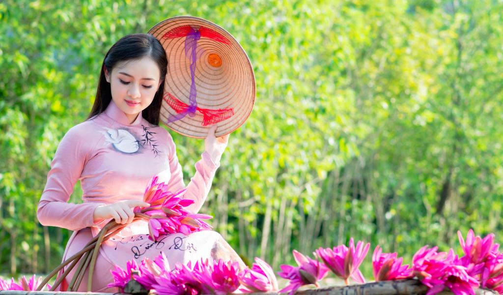 Wallpaper Beautiful asian girl in a boat with lotus flowers