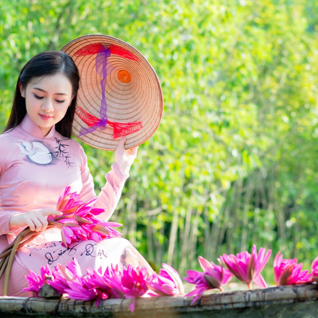 Wallpaper Beautiful asian girl in a boat with lotus flowers
