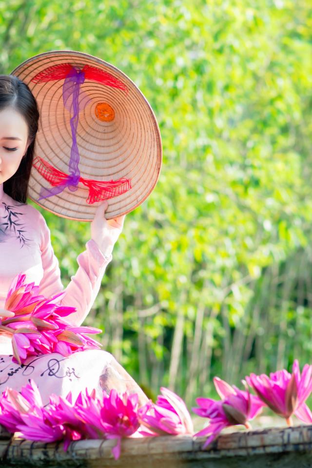 Wallpaper Beautiful asian girl in a boat with lotus flowers