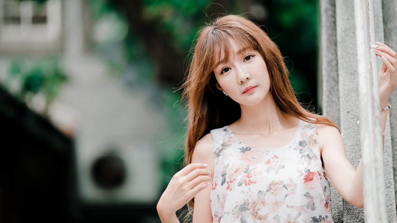 Wallpaper Long-haired Asian stands by the wall