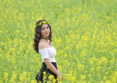 Wallpaper Asian girl in a beautiful dress walks across the field with cosmea flowers