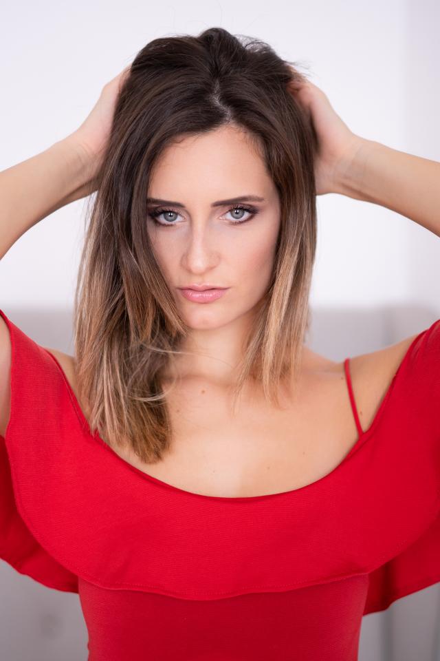 Wallpaper Beautiful girl in a red dress with hands in hair