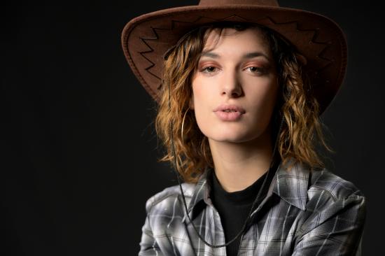 Wallpaper Young girl in a cowboy hat on a gray background
