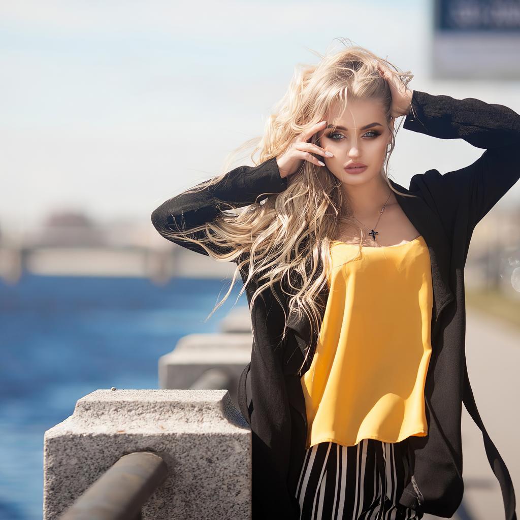 Wallpaper Spectacular blonde in a black coat stands by the water