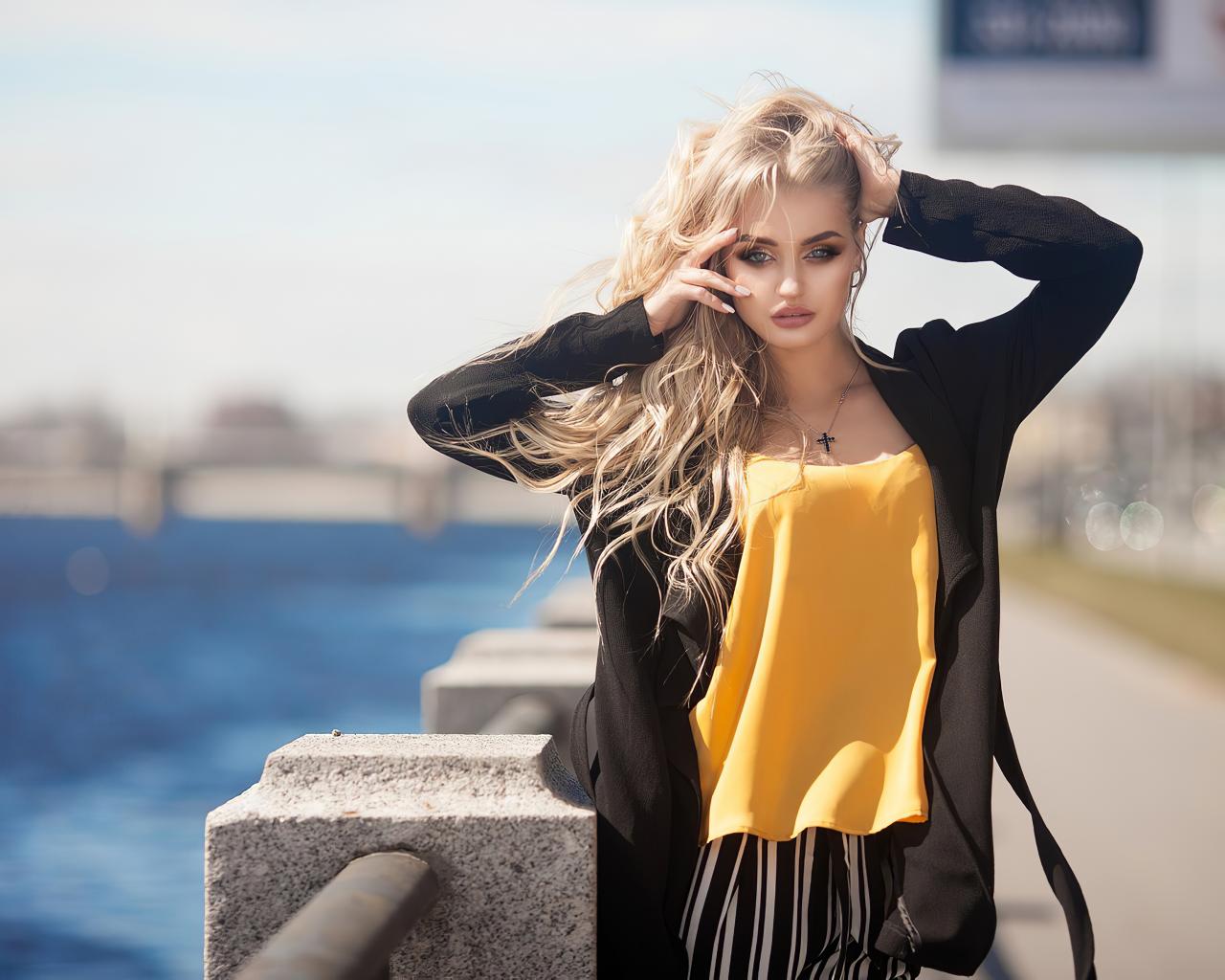 Wallpaper Spectacular blonde in a black coat stands by the water