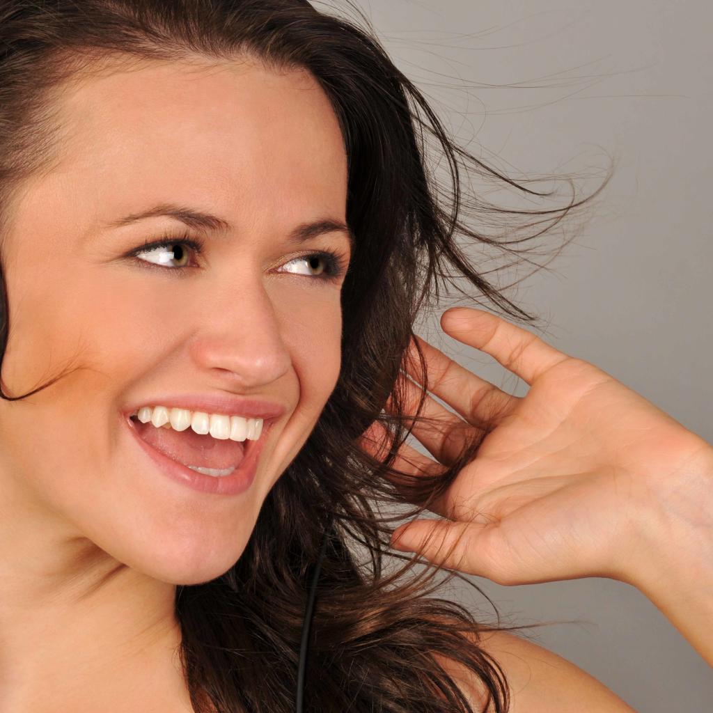Wallpaper Smiling girl in headphones on a gray background