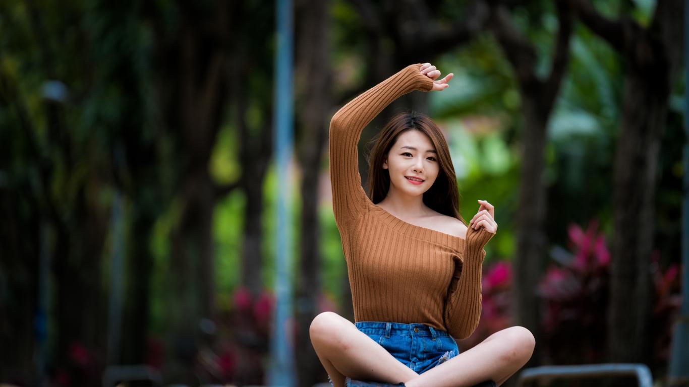 Wallpaper Asian girl sitting in lotus position in the park.