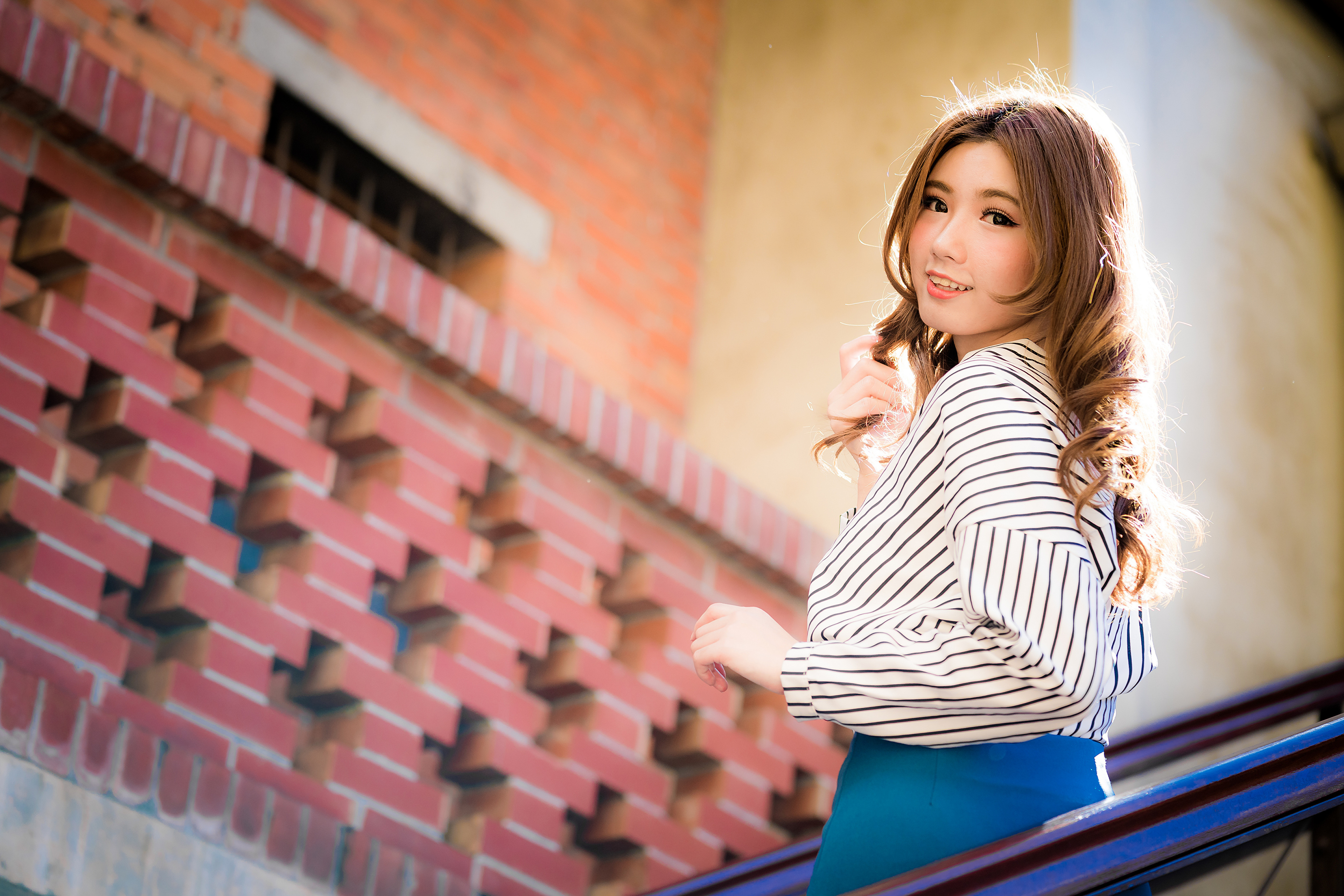 Wallpaper Beautiful smiling asian woman stands on the stairs