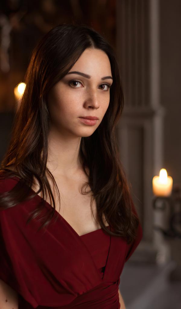 Wallpaper Brown-eyed girl in a red dress in a room with candles