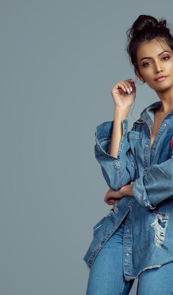 Wallpaper Beautiful girl in a jeans suit on a gray background