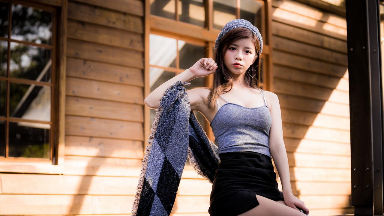 Wallpaper Young Asian girl in a short skirt sits on a windowsill