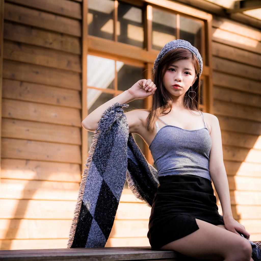 Wallpaper Young Asian girl in a short skirt sits on a windowsill
